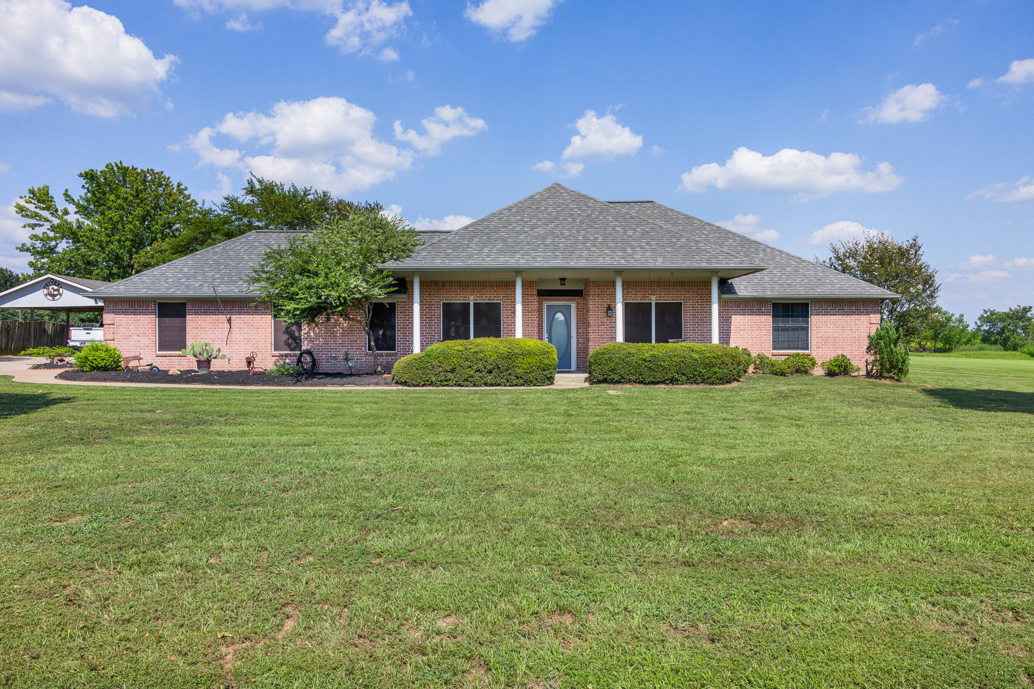 Step outside and you’ll find the perfect balance of relaxation and utility. A sparkling pool with rock accents and a covered patio make the backyard a natural gathering spot, while a third bathroom adds outdoor convenience. Beyond the pool, the barn is set up with three stalls, runs, and electricity—ideal for show animals, FFA or 4-H projects, or hobby livestock. A storage shed offers even more flexibility, and the two-car garage plus two-car carport ensure plenty of parking.