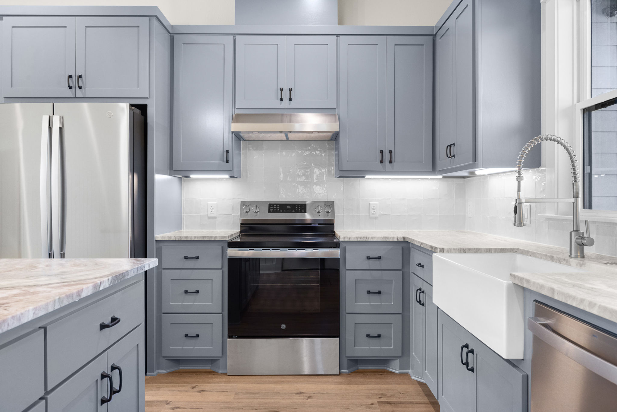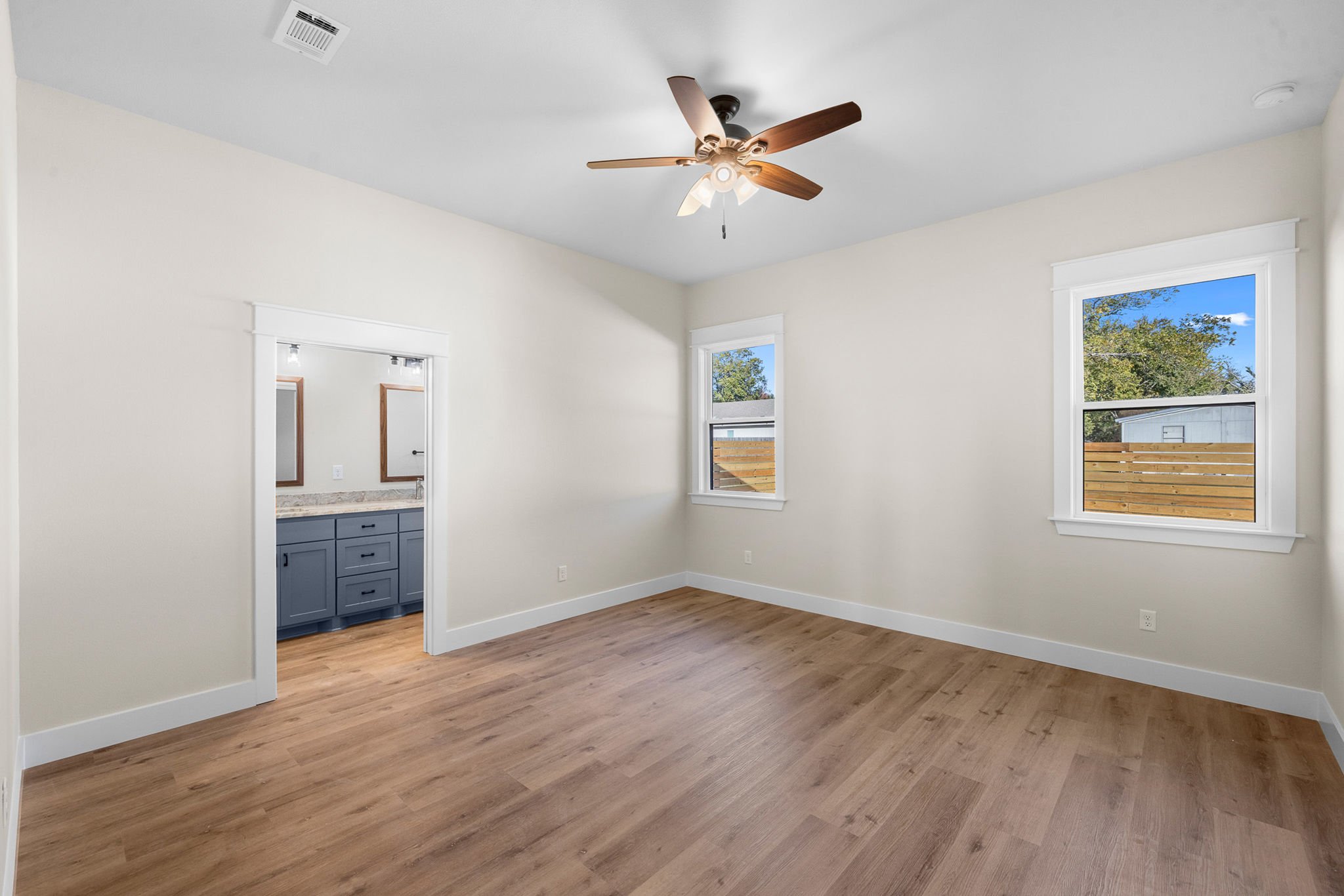 The kitchen is set up for everyday life with shaker-style cabinets, a farmhouse sink, and a practical mud area that keeps things organized as you come and go. The split floor plan gives the primary suite privacy, along with an ensuite that includes dual sinks, a walk-in shower, and a custom closet with built-ins.