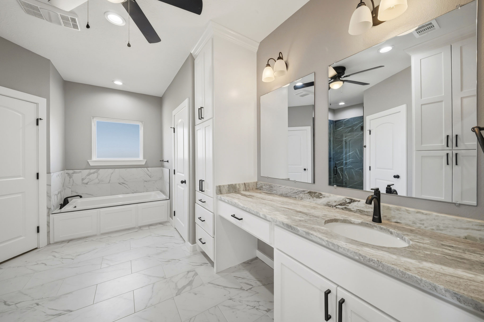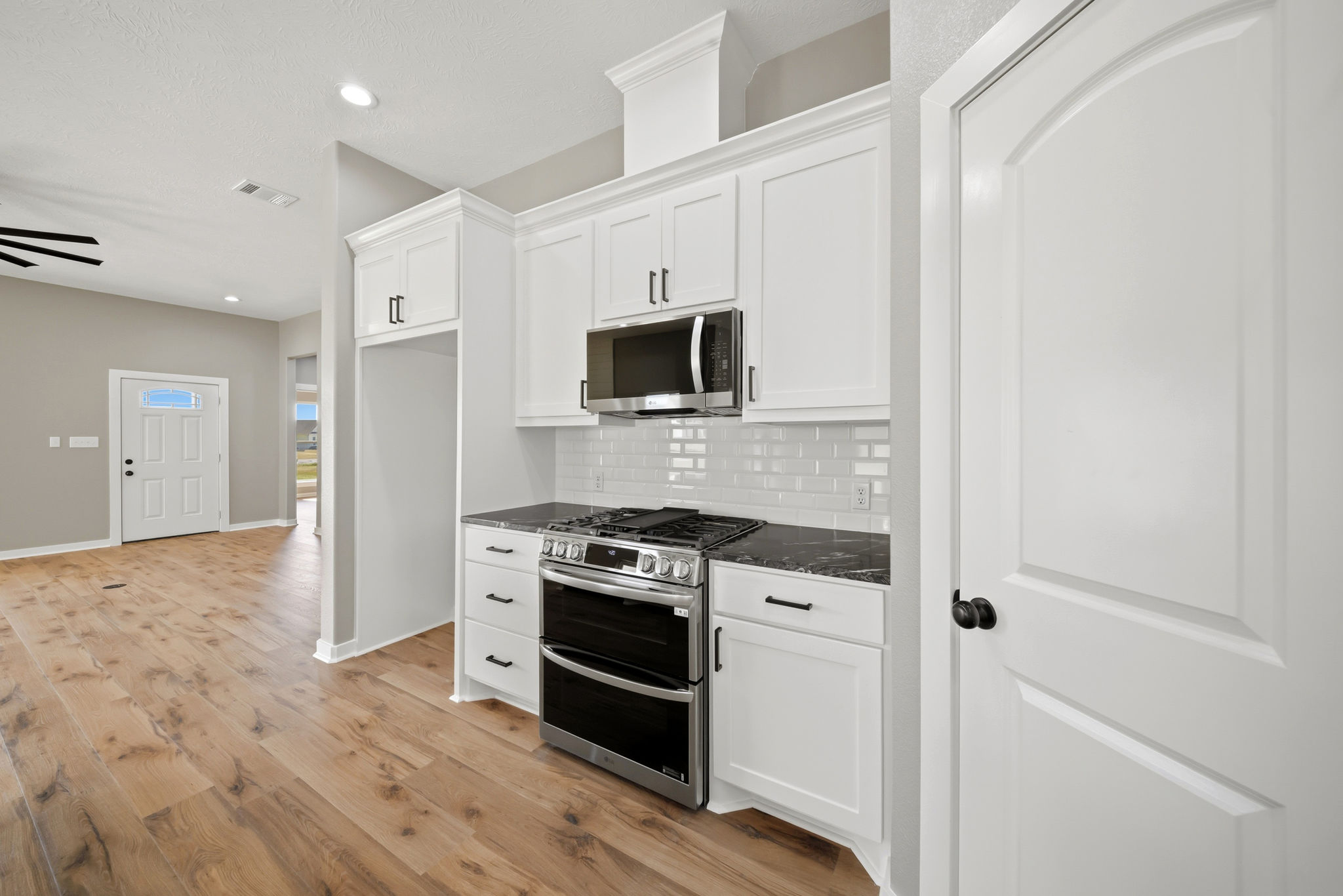 Built with everyday living in mind, it offers an open floor plan, a fireplace, and oversized plank LVP flooring throughout the main spaces. The kitchen is a real centerpiece with a large island topped in black granite, stainless steel appliances—including a gas range—plus soft-close cabinetry and a clean subway tile backsplash. The primary suite includes a soaking tub, walk-in shower, dual sinks, and a walk-in closet designed for function. Practical upgrades include a tankless water heater, a spacious utility room with sink and storage, and quality fixtures throughout.